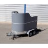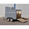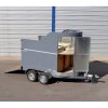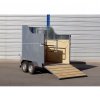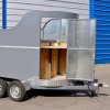 Carro de Arrastre para 2 Caballos; Revestimiento exterior metálico galvanizado y interior en terciado marino 15mm de espesor. Frente curvo metálico con puerta lateral con llave para acceso a guardar monturas y aperos. incorpora superficie para comedero y espacio cerrado con llave para aperos.